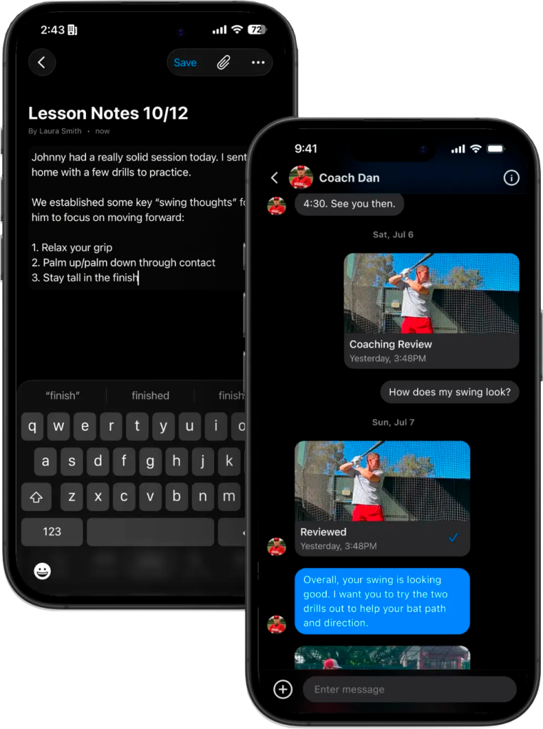 Store metrics, swing videos, and notes to track improvement, showcase results, and create an ongoing development record for every athlete.